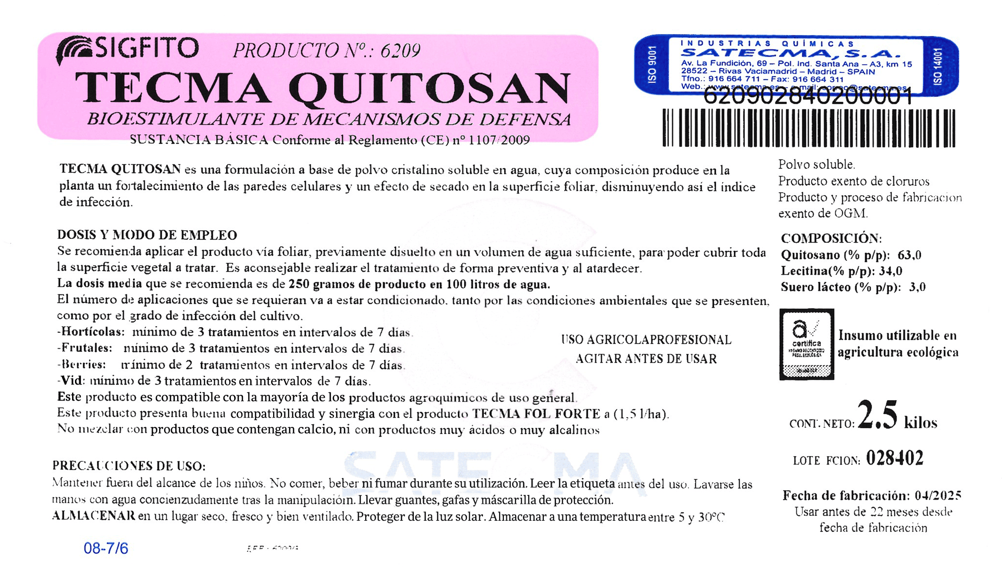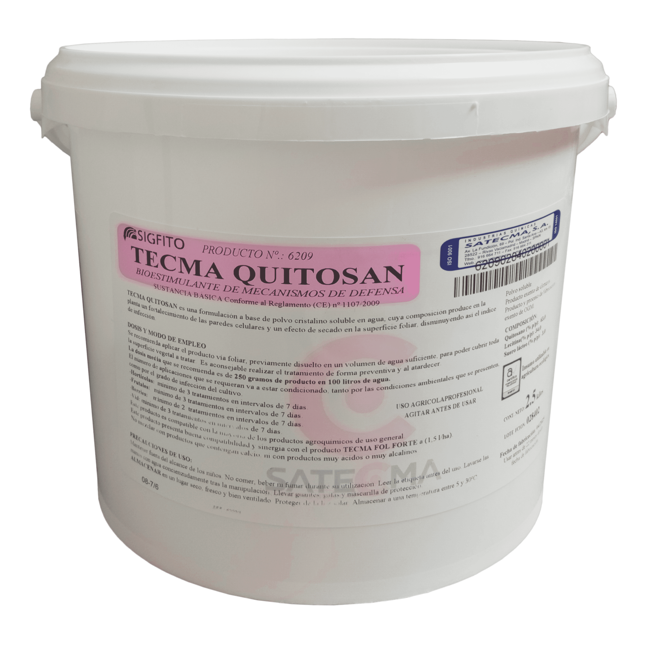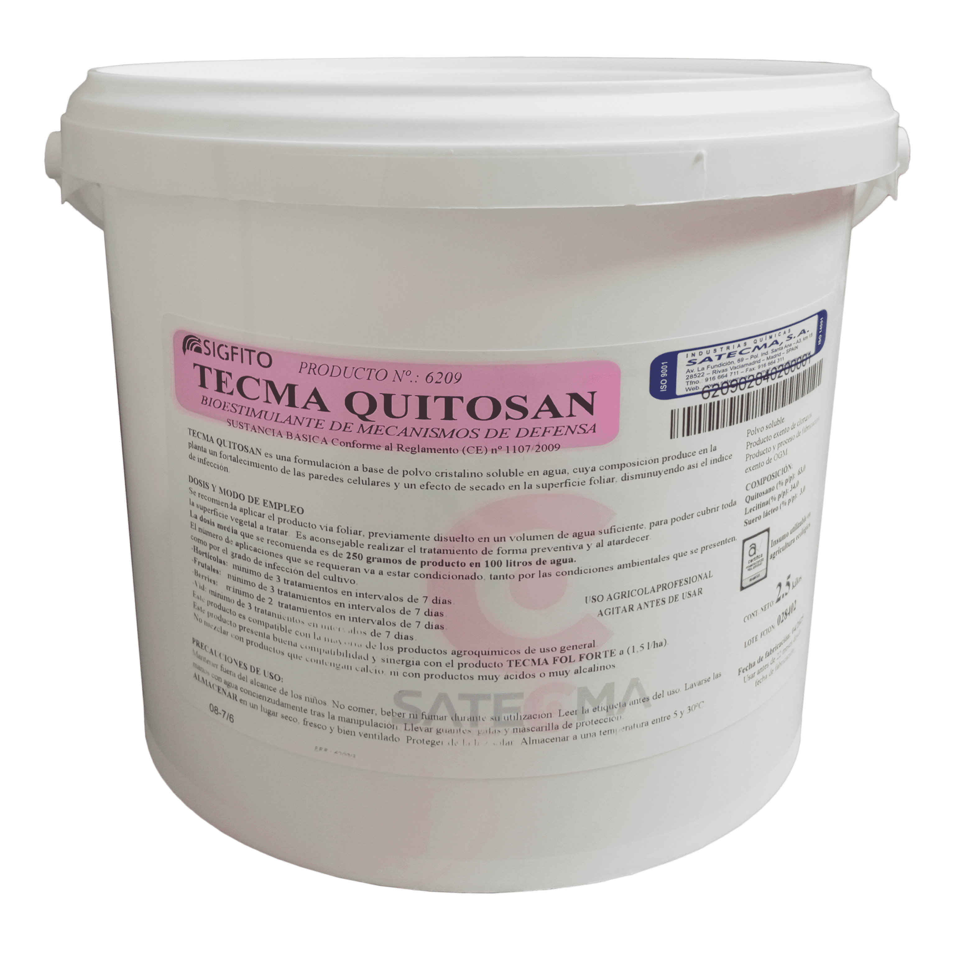 TECMA QUITOSAN es una formulación a base de polvo cristalino soluble en agua, cuya composición produce en la planta un fortalecimiento de las paredes celulares y un efecto de secado en la superficie foliar, disminuyendo así el índice de infección.